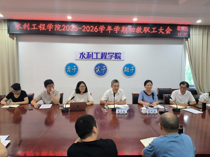 9月5日,水利工程学院在A319会议室召开2025-2026学年第一学期期初教职工大会,全面部署新学期重点工作。学校校长王卫标,校党委委员、工会主席吴玲洪出席会议并讲话。会议由学院院长金斌斌主持,全体教职工参会。