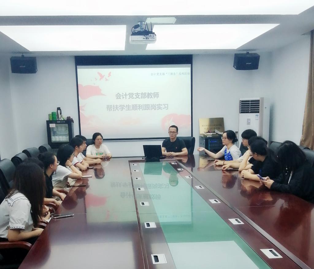 为了确保实习工作顺利开展,使同学们充分认识到实习的重要性,2021年6月23日中午,会计党支部在B306会议室召开了教师帮扶学生顺利跟岗实习大会。