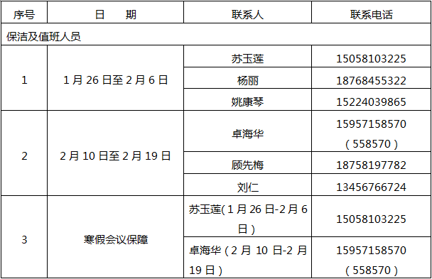 2、校园保洁及教学楼开关门值班人员安排。教学区域1月26日起开始实行闭门管理,若有教师需进入教学楼,请电话联系后勤值班人员徐日兰。电话13777860213(660213)。