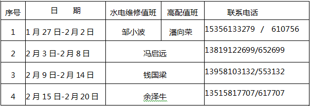 水电维修值班电话: 83863099 高配值班电话: 83863014