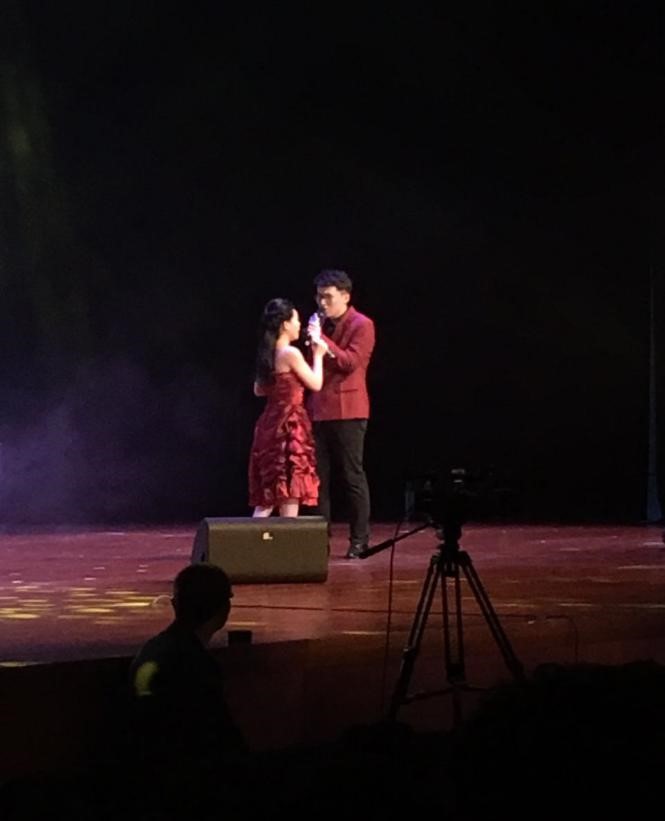 比赛有声有色地进行,场上竞争也愈发激烈,很快,我校的第二组选手在万千目光的注视下闪亮登场,他们带来的是一首“当时”,男才女貌默契的表演让此歌熠熠生辉,一开口,就把大家带入他们营造的气氛中,随之而来是导师的好评和观众的不断掌声。
